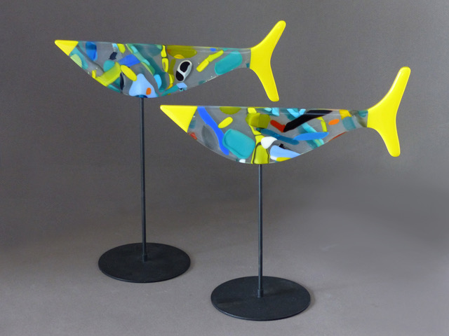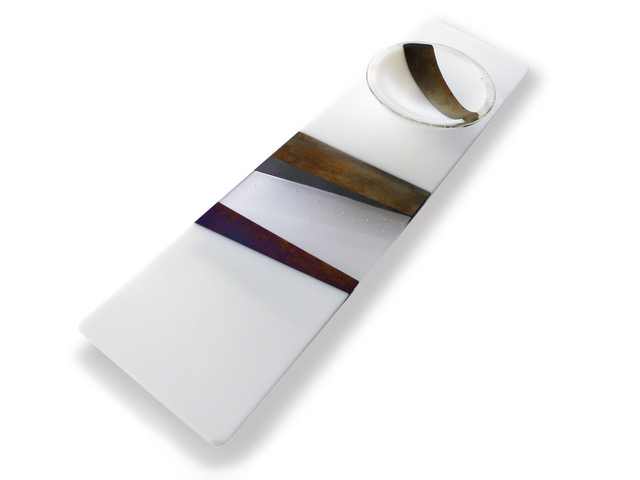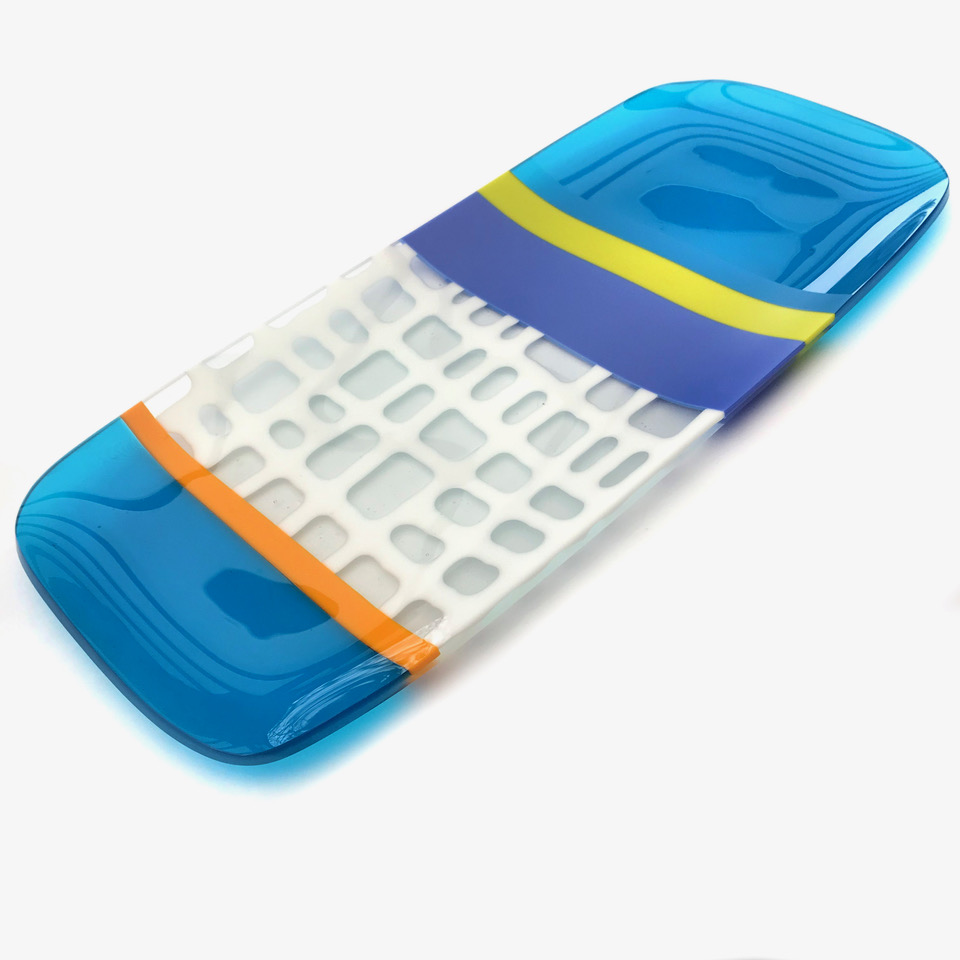 Her kiln-formed glass is clean and contemporary, shaped by her graphic design sensibility. Attention to detail, refined finishes, and a strong use of colour, pattern, and texture define her functional and sculptural pieces—elegant additions to home, office, or body.